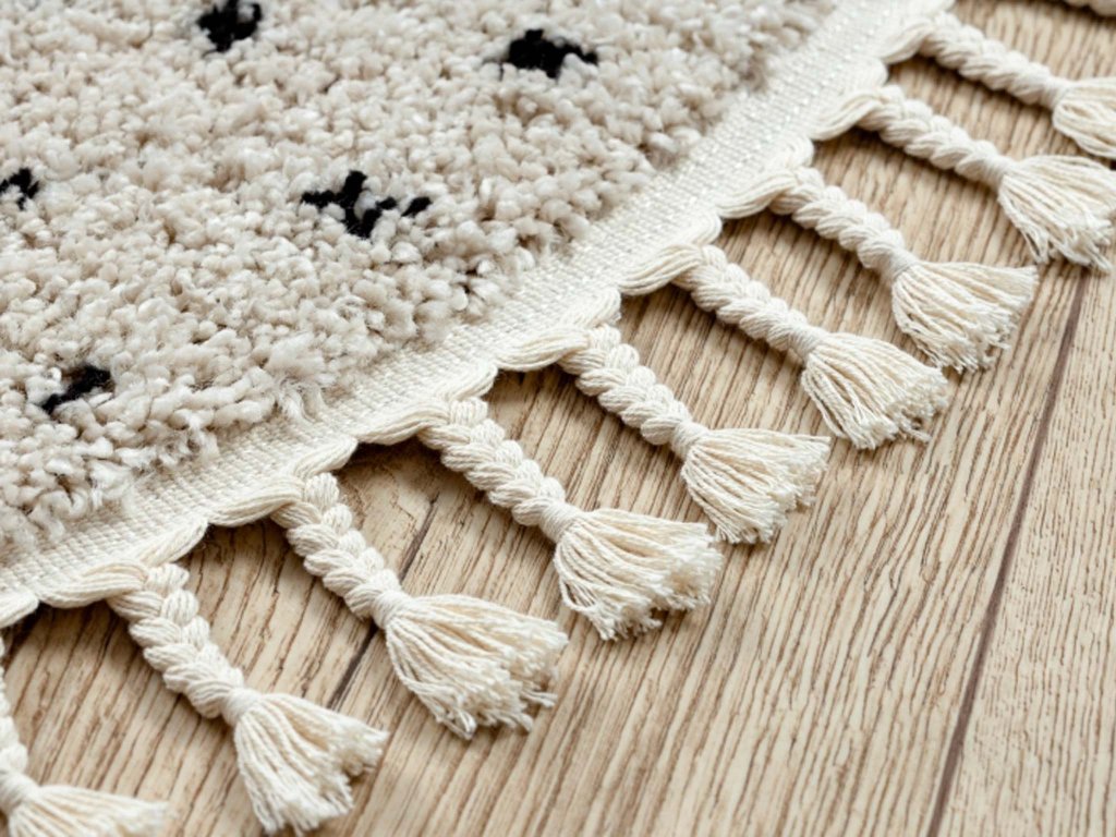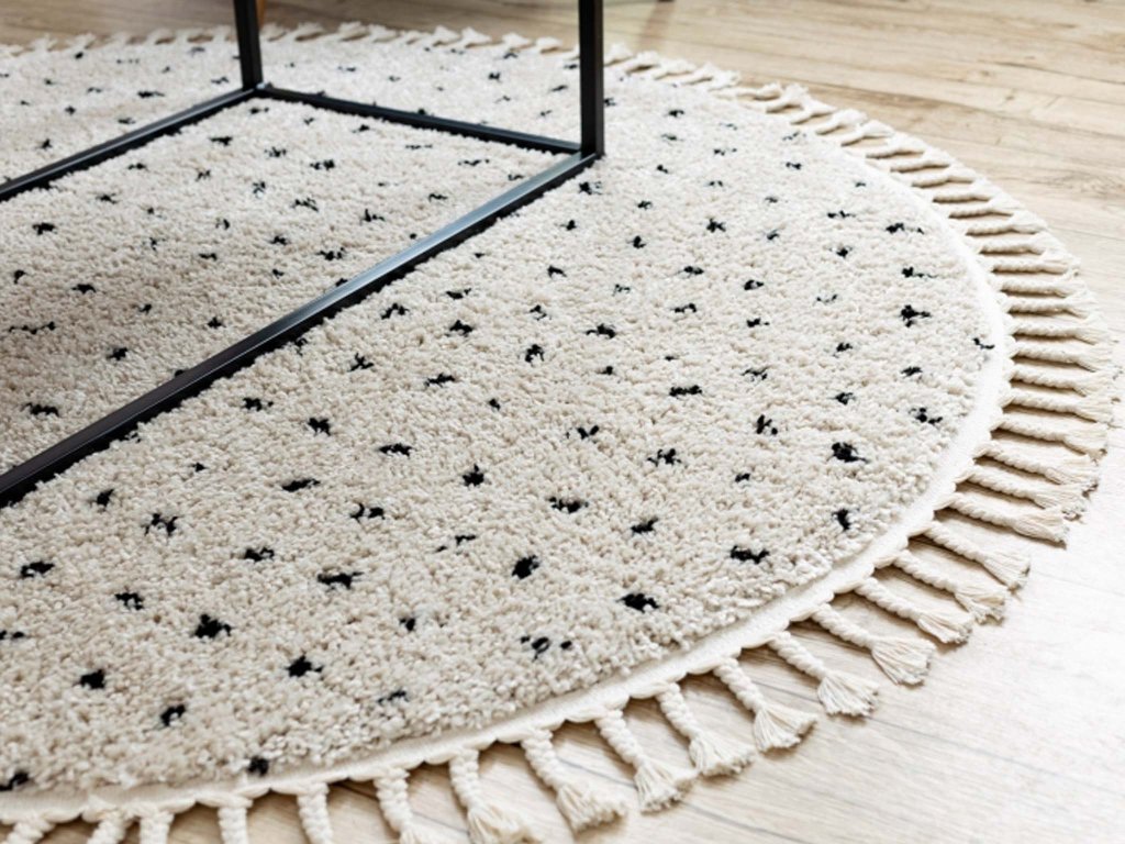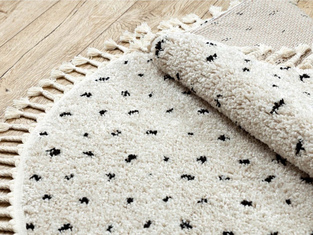 Predstavljamo vam tepih Bermie - savršen prijatelj za ugodnu atmosferu u vašem domu. Ovaj šarmantni tepih izrađen je od 100% polipropilena, što jamči ne samo otpornost i trajnost, već i jednostavno održavanje. Njegov okrugli oblik s crnim točkicama dodaje vašem prostoru stilski i moderan dodir. Visoka vlakna shaggy čine tepih Bermie ne samo vizualno privlačnim, već i ugodno mekanim i udobnim na dodir. Nakon dugog dana pružit će vam zasluženi odmor i udobnost, istovremeno dodajući vašem interijeru toplu i ugodnu atmosferu. Tepih je dodatno ukrašen pletenim resama, koje njegovom dizajnu dodaju još više karaktera. Razveselite svoj dom s tepihom Bermie, koji vam pruža ne samo estetsku vrijednost, već i udobnost svaki dan.
