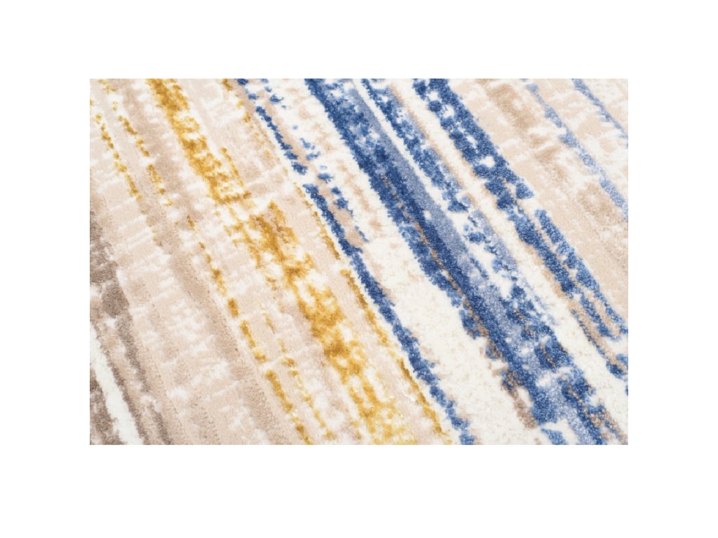 Bijelo-smeđi tepih Pat ističe se svojim plavim prugastim elementima. Polipropilenska vlakna od kojih je tepih izrađen, izuzetno su mekana i elastična. Tepih se ne deformira, otporan je na habanje i lako se čisti. Dizajn ovog tepiha predodređen je za dječju ili dnevnu sobu. Odlično će nadopuniti kako moderan, tako i klasičan interijer.