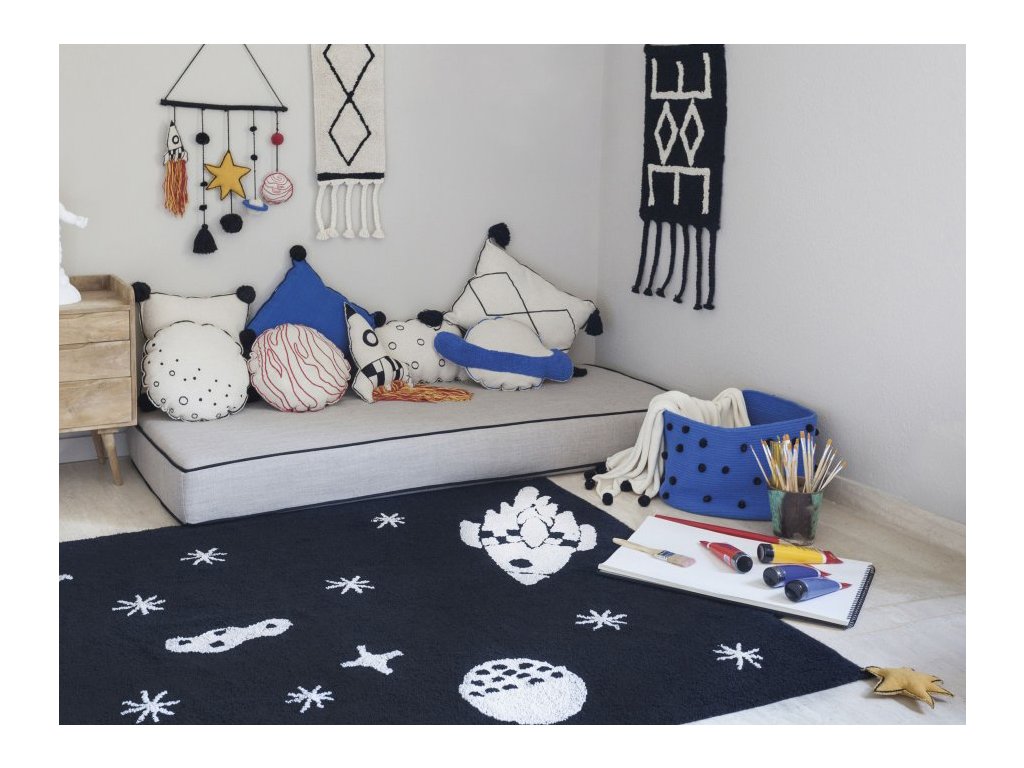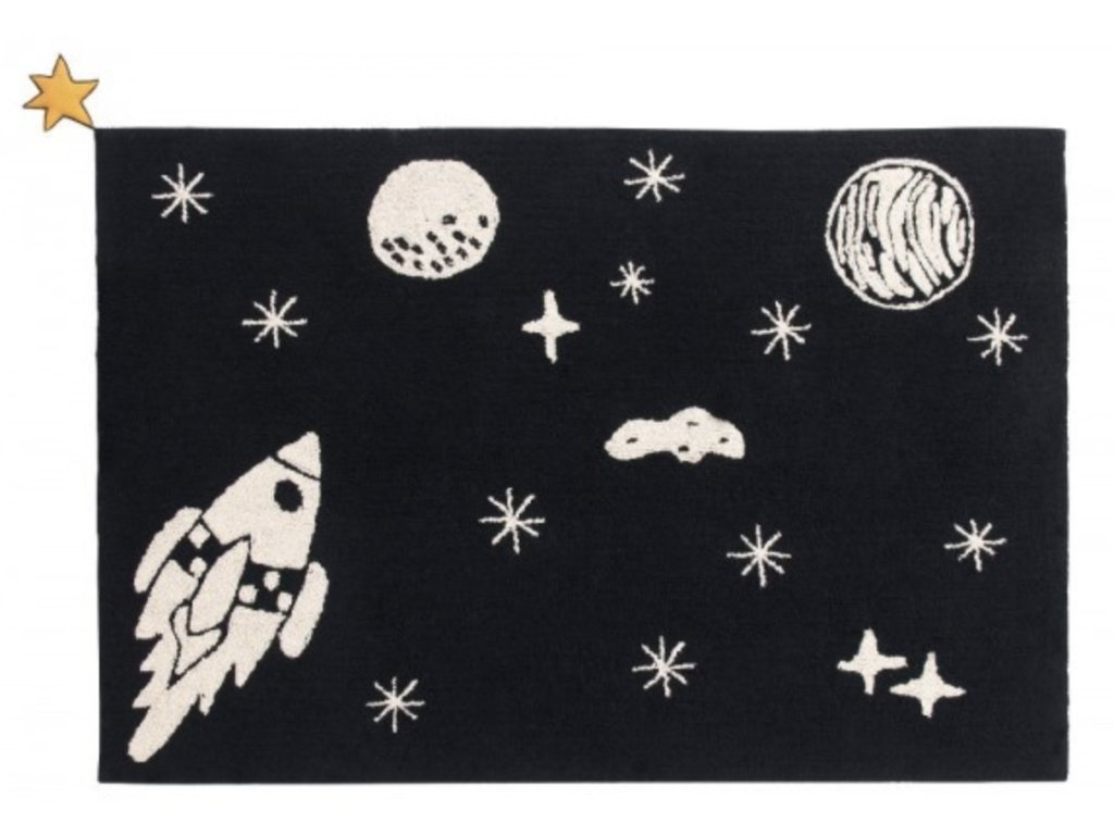 Dječji tepih SPACE je izrađen od 100% prirodnog pamuka. Ukrašen je uzorkom koji simbolizira svemir. Pravokutni tepih, zahvaljujući upotrebi pamuka, mekan je i fleksibilan. Proizvod ima mnogo certifikata ISO 9001, ISO 14001 i ISO 18001, kao i certifikate AITEX, koji jamče kvalitetu obrade za zdravlje i sigurnost korisnika. Također jamči izvrsnu toplinsku izolaciju. Unosi udobnost i moderan dizajn u interijer. Izvrsna ponuda za dječake, ali i djevojčice, a posebno za ljubitelje galaktičkih avantura. Dostupan je u dimenziji 140x200 cm.