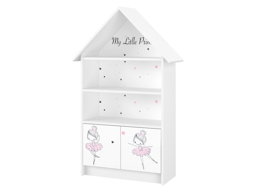 Dječji regal u obliku kućice prekrasan je dodatak dječjoj sobi. Njegov motiv balerine razveselit će svaku malu, buduću plesačicu. Regal se sastoji od otvorenih polica i ormarića.