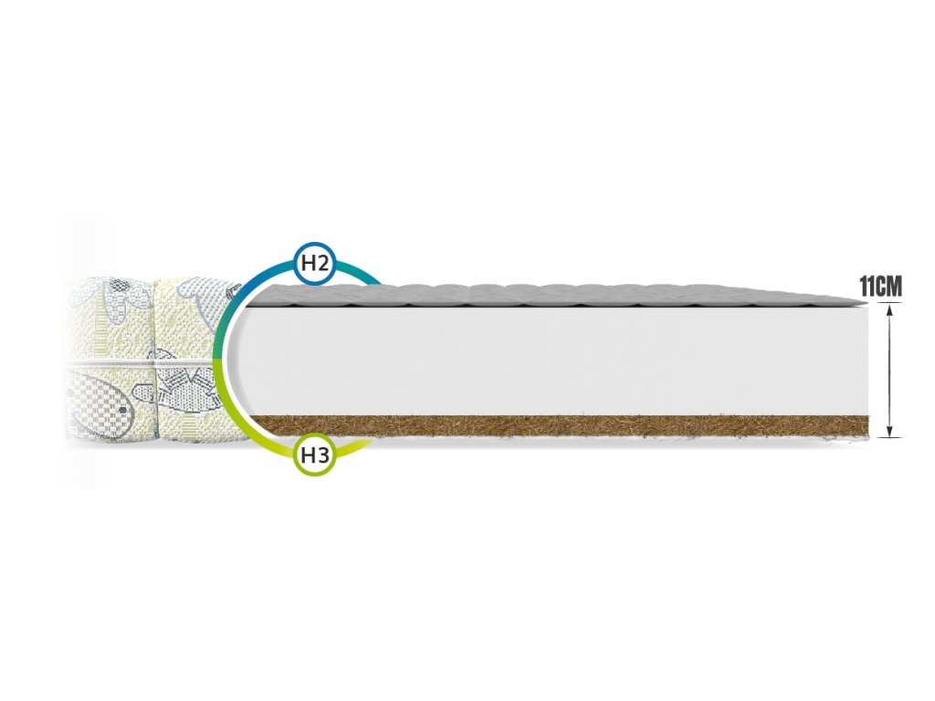 Kvalitetan pjenasti dječji madrac Midino 80x160 stvoren posebno za djecu. Jezgra madraca je poliuretanska pjena FlexFoam. Ovaj materijal se ne deformira, zahvaljujući čemu je madrac uvijek udoban i osigurava ugodan san za vaše dijete. Kvalitetna pjena pruža dobru potporu kralježnici. Kokosov sloj ima zdravstvene prednosti. Štiti madrac od razvoja bakterija i dodatno ima antialergijska svojstva. Kokosova vlakna su lagana i prozračna, a također i fleksibilna i otporna na vlagu i deformacije. Vlakna poboljšavaju cirkulaciju zraka u madracu i sprječavaju pretjerano znojenje. Madrac ima odvojivu navlaku DINO, koja je izrađena od jedinstvene tkanine, otporne na mrlje. Inspirirana je prirodom, konkretno cvijetom lotosa. Kada pada kiša, voda s listova lotosa teče zajedno s prljavštinom i listovi ostaju suhi i čisti. Tkanina na navlaci ima mikroskopsku trodimenzionalnu strukturu. Voda s madraca teče i ne ostavlja na njemu nečistoće. Prozračna navlaka štiti madrac od mrlja i nastanka plijesni. Heljdin sloj od prirodnih ljuski heljde zatvoren je u prošivenim posebnim zonama. Ovaj sloj sprječava nastanak defekata kralježnice i pomaže u liječenju već postojećih. Tanini u ljusci heljde sprječavaju razvoj grinja. Heljdin sloj ima antibakterijska i antidekubitalna svojstva.