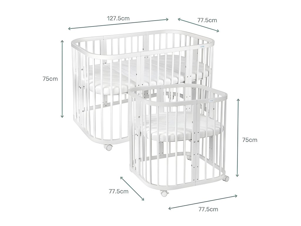 Dječji rastući krevetić 7u1 u omiljenoj bijeloj boji je zaista multifunkcionalan i bit će dio vašeg doma nekoliko godina. Najmanji dio je pomoćni krevetić za bebu, koji možete staviti odmah uz bračni krevet i pričvrstiti ga posebnim sigurnosnim pojasom kako se ne bi pomaknuo. Do 6 mjeseci djeteta možete koristiti i manju veličinu krevetića na kotačima s pultom za presvlačenje. Kotači imaju sigurnosnu kočnicu. Kada otkočite krevetić, možete ga lako premještati i premjestiti ga u dnevni boravak ili kuhinju. Dječji rastući krevetić dostupan je u nekoliko boja.