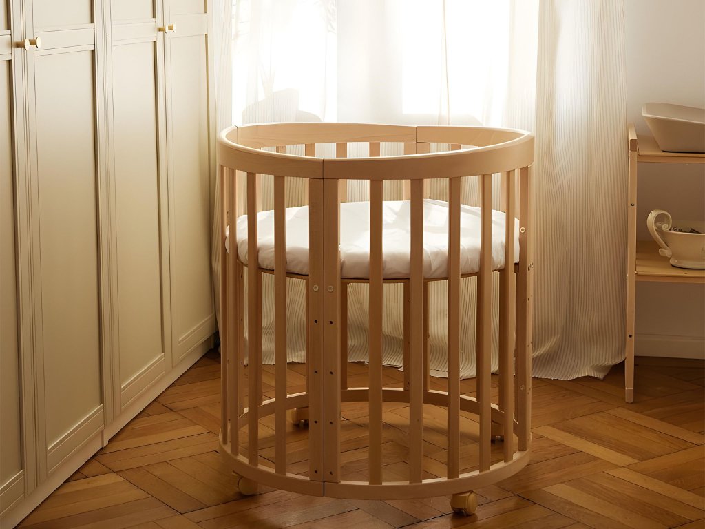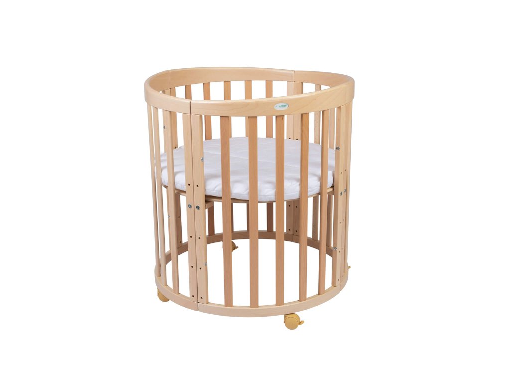 Okrugli rastući krevetić izrađen je od bukovog drveta i ima ekološki premaz na bazi vode koji zadovoljava europski standard EV 71-3. Premaz je siguran za djecu i otporan je na mehanička oštećenja. Trodijelni madrac je od pjene T25 s pamučnom navlakom. Navlaka se može prati na 30° C. Rešetka u krevetiću može se postaviti u 5 položaja, od 7 cm do 49 cm u najvišem položaju. Kada na krevetić montirate gumene kotačiće, visina rešetke u najvišem položaju bit će 55 cm.