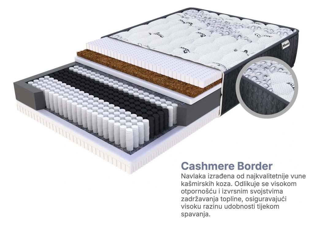 Madrac ima ekskluzivnu navlaku Cashmere Border. Ova navlaka je izrađena od najkvalitetnije vune kašmirskih koza. Navlaka je izdržljiva, elastična i vrlo ugodna na dodir. Osim toga, ima izvrsna svojstva zadržavanja topline što osigurava visoku udobnost tijekom spavanja. Navlaka nije uklonjiva. Zahvaljujući proizvodnoj tehnologiji aktivnih probiotika Purotex® navlaka je antialergijska, prozračna i otporna na nečistoće i rastezanje.