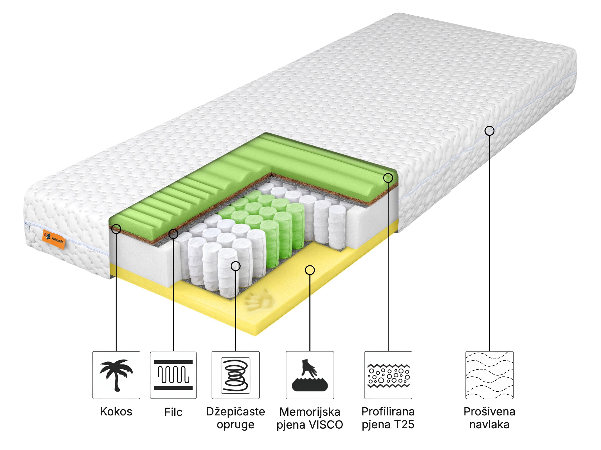 Sastav materijala: džepićaste opruge (7 zona), podloga od filca, kokosova ploča 1 cm, poliuretanska pjena T25, visco memorijska pjena