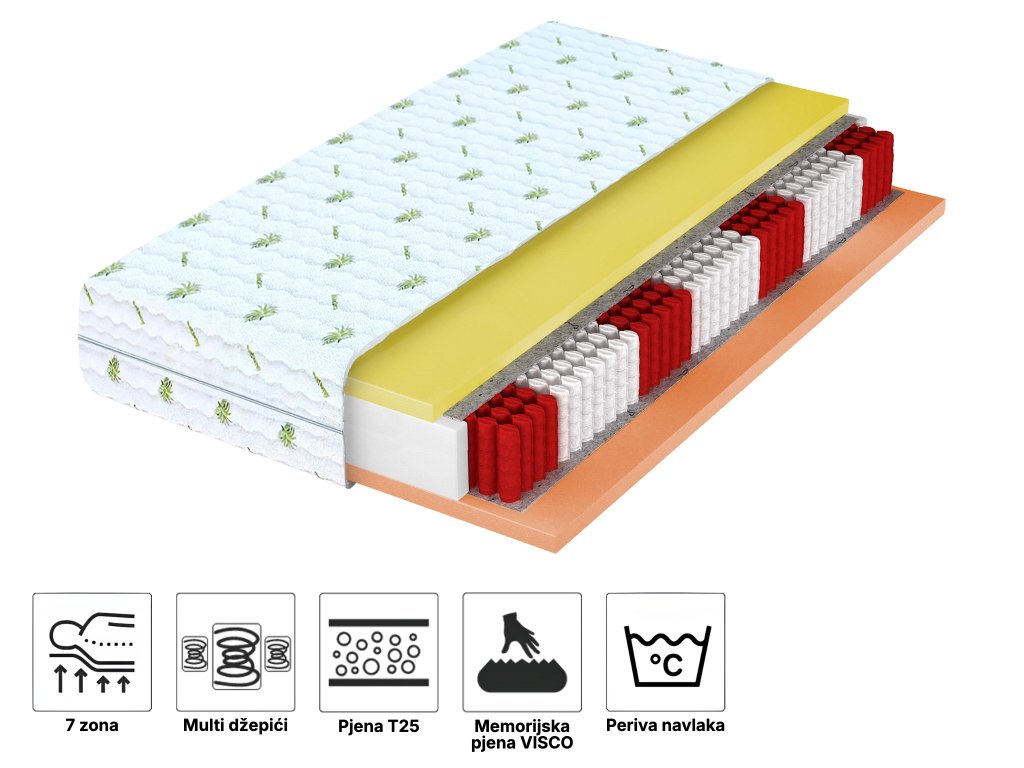 Materijalni sastav: Memorijska pjena Visco, Filc, Multipocket NanoHARD, Poliuretanska pjena, Navlaka