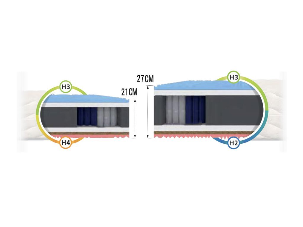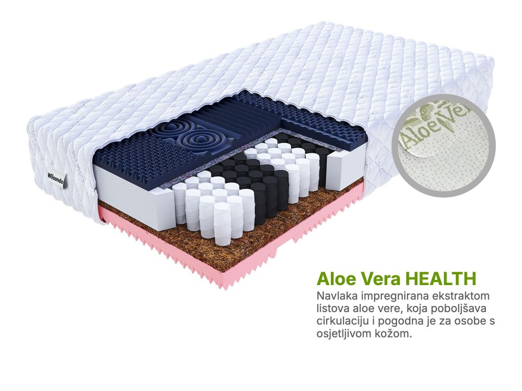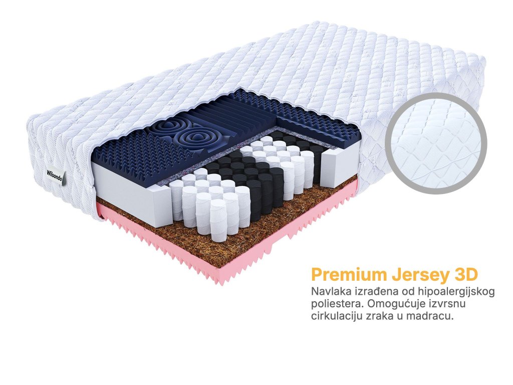 Materijalni sastav: Poliuretanska pjena gustoće 25 kg/m3, Džepićaste opruge, masažna hladna HR pjena, memorijska pjena Visco gustoće 40 kg/m3, kokos, navlaka