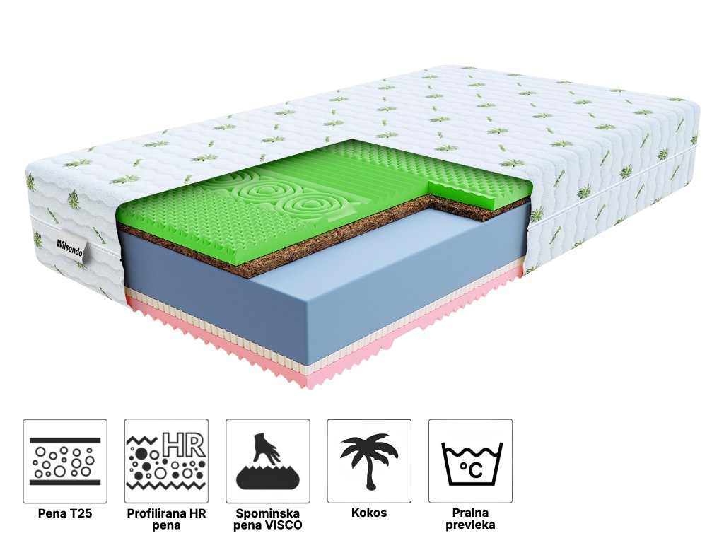 Materijalni sastav: Profilirana hladna HR pjena, Lateks, Kokos, Poliuretanska pjena, Profilirana memorijska VISCO pjena