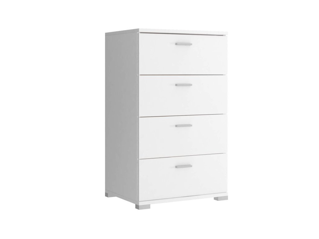 Kombinacija u nježnoj bijeloj boji ponudit će vam velikodušan prostor za pohranu raznih predmeta, odjeće ili dokumenata. Na gornji dio možete smjestiti biljke ili dekoracije. Svoju primjenu pronaći će u dječjoj sobi, dnevnom boravku ili spavaćoj sobi. Izrađena je od 16 mm laminirane ploče. Rubovi su završeni ABS trakom. Namještaj ima 4 prostrane ladice.