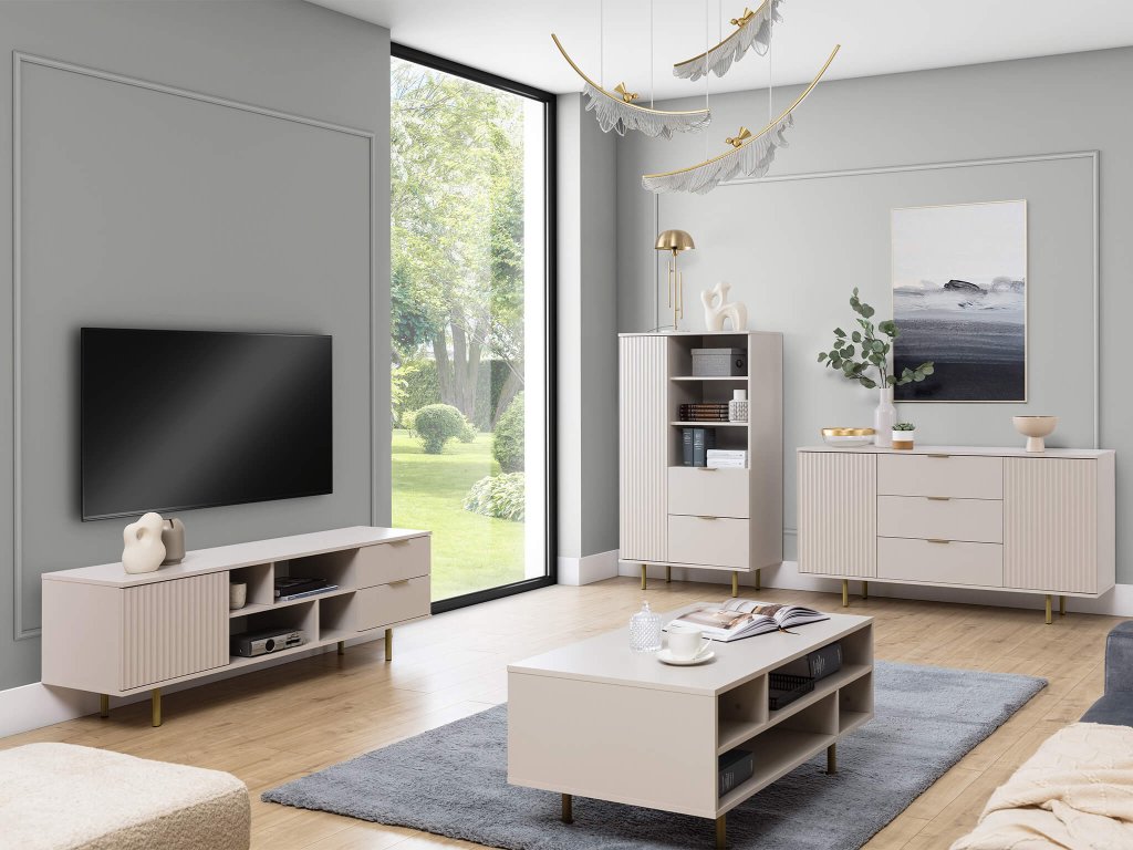Kolekcija NUBIA sastoji se od mnogo namještaja kao što su ormarići, vitrine, stolić za kavu ili TV stolić. Boja kolekcije je u neutralnoj bež boji, koja je povezana s metalnim elementima na namještaju. Zlatne noge i ručke na namještaju dodaju kolekciji eleganciju i istovremeno osjećaj luksuza. Sastoji se od laminirane ploče, čija je debljina 16 mm, a namještaj ima ABS rubove, koji su čvrsti i izdržljivi. Kolekciju je moguće uklopiti u dnevni boravak, ali dijelom i u radnu sobu. Tamni kućni dodaci kao npr. tepih, zavjese ili deka oživjet će prostor u kojem će se nalaziti.