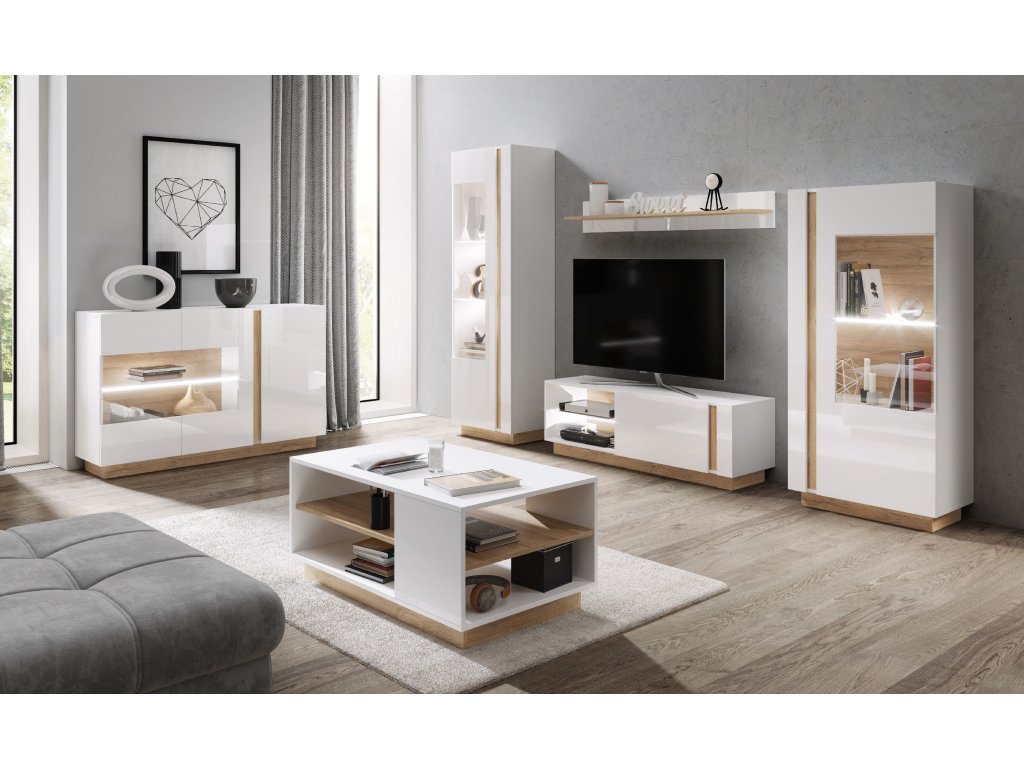 Namještaj iz kolekcije PENNY privući će vas na prvi pogled svojim modernim i stilskim dizajnom. Namještaj je izrađen od visokokvalitetne laminirane ploče (DTD) debljine 16 mm, koja je otporna na ogrebotine, vlagu i visoke temperature. Namještaj se odlikuje kvalitetnim ABS rubovima, sustavom bez ručki i u vitrinama se nalaze staklene police. Dostupan je u dvije boje, u kombinaciji mat i sjajne bijele s hrastom grandson ili hrast artisan u kombinaciji s grafitom. Namještaj se zahvaljujući svom jednostavnom dizajnu i zanimljivoj kombinaciji boja uklapa u svaki interijer.