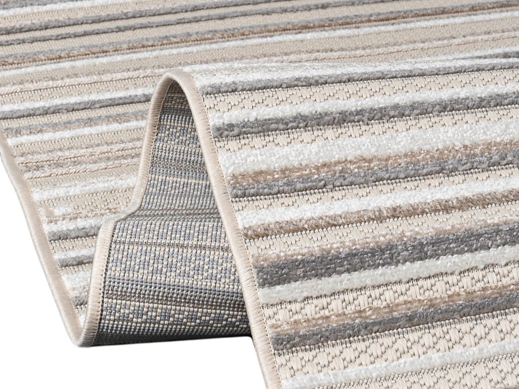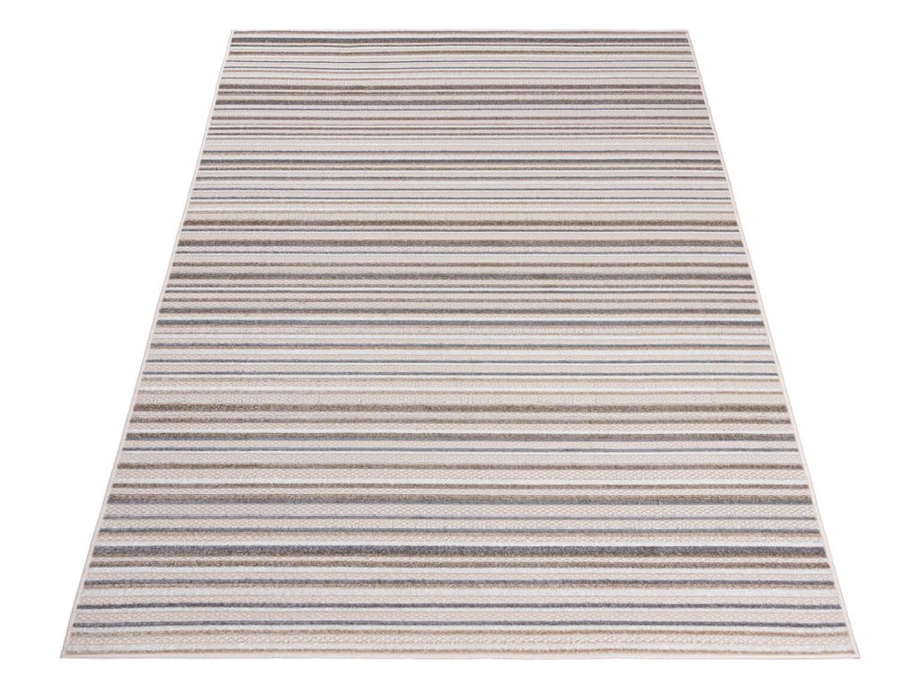 Bež tepih s gustoćom vlakana 1500g/m2 i niskim vlaknom 6 milimetara. Izrađen je od polipropilenskih vlakana koja su mekana i fleksibilna. Tepih se ne deformira i odlikuje se visokom otpornošću na habanje. Cijenit ćete jednostavno održavanje zahvaljujući niskom vlaknu. Prugasti tepih uklopit će se u dnevni boravak, spavaću sobu ili dječje i studentske sobe. Osvježit će moderan i tradicionalan interijer vašeg doma.