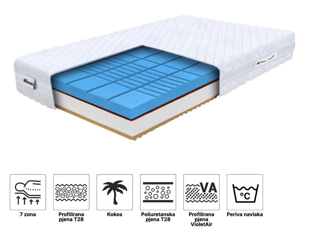 Materijalni sastav: Profilirana poliuretanska pjena T28, Poliuretanska pjena T28, Profilirana pjena VioletAir, Kokosov sloj