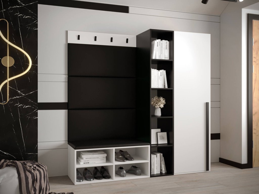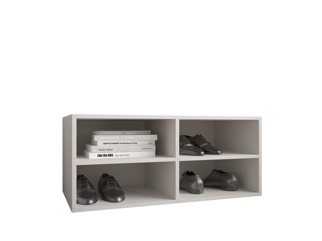 Moderan otvoreni stalak za cipele Miro za organizaciju vaših cipela. Bijela polica za obuću idealna je za svako kućanstvo. Univerzalni i istovremeno jednostavni dizajn lako ćete uskladiti s bilo kojim interijerom. Uz stalak za cipele usklađen je i panel s vješalicama, koji možete objesiti na visinu koja vam odgovara. Vješalica za zid savršeno će nadopuniti vaš hodnik. Na bijeloj osnovi nalaze se 4 metalne vješalice u crnoj boji. Stalak za cipele izrađen je od kvalitetne laminirane ploče debljine 16 mm. Rubovi su zaštićeni PVC furnirom. Stražnji dio izrađen je od HDF ploče. Stalak za cipele nudi vam 4 pretinca za pohranu vaše obuće.