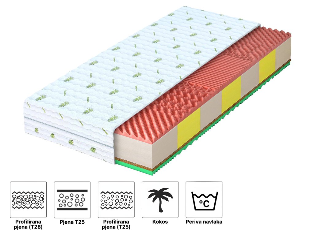Materijalni sastav: profilirana poliuretanska pjena T28, poliuretanska pjena T25, kokosov sloj, profilirana poliuretanska pjena T25, prošivena navlaka Aloe Vera