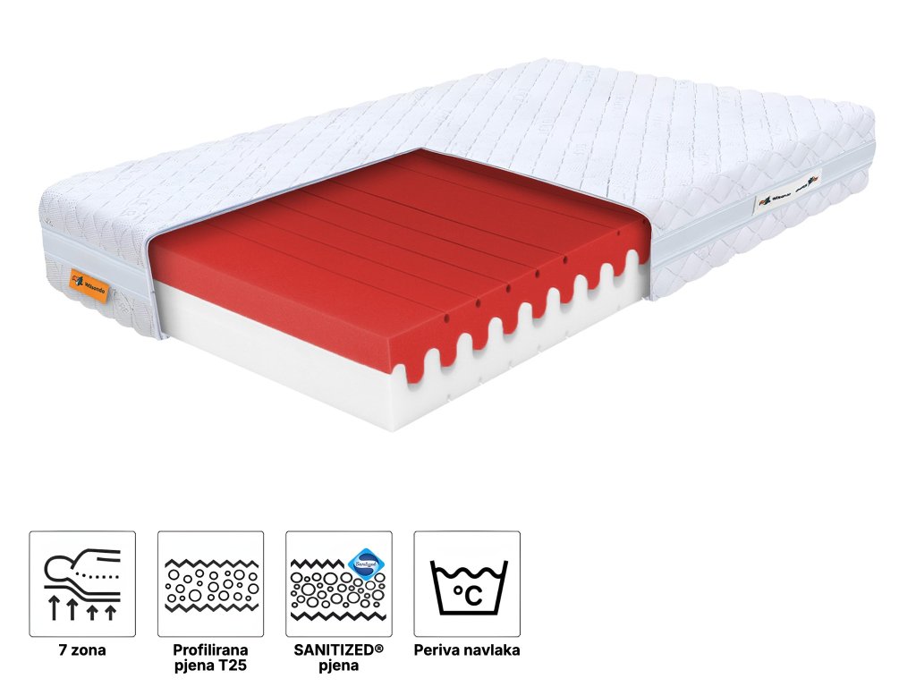Profilirana 7-zonska visokokvalitetna pjena poboljšava cirkulaciju krvi u koži i opuštanje mišića tijekom spavanja. Pod utjecajem tjelesne temperature prilagođava se obliku tijela, čime povećava osjećaj ugodnog sna. Zahvaljujući sustavu 7 zona tvrdoće, pruža prirodan položaj i potporu kralježnici i cijelom tijelu. Ova pjena također je prikladna za alergičare.