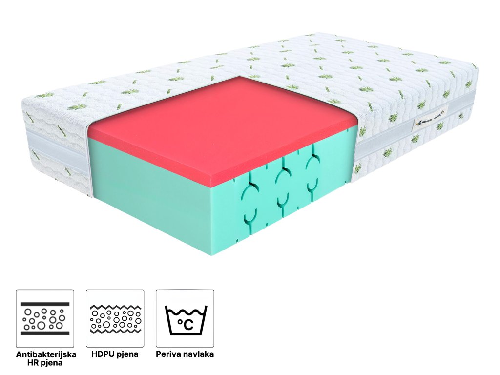 U srcu madraca nalazi se sloj izrađen od antibakterijske HR pjene, koja osigurava izvrsnu elastičnost i dugotrajnu izdržljivost. Ova pjena ne samo da pruža udobnu potporu, već također aktivno sprječava razmnožavanje bakterija i grinja, čime prostor za spavanje održava čistim i zdravim. U kombinaciji s HDPU pjenom visoke gustoće madrac osigurava izvrsnu potporu i raspodjelu tjelesne težine, što doprinosi regenerativnoj i neometanoj noći. Omotač madraca Luna izrađen je od kvalitetne odvojive navlake koji sadrži Aloe Veru. Ova jedinstvena značajka daje navlaci antibakterijska svojstva i istovremeno osigurava dugotrajnu čistoću i svježinu. Osim toga, navlaka se lako može ukloniti i prati na temperaturi do 30 stupnjeva, što olakšava održavanje madraca u besprijekornom stanju. 3D traka na navlaci madraca je inovativna tehnologija koja osigurava učinkovitu ventilaciju i optimalnu cirkulaciju zraka. Ovaj poseban sloj materijala pomaže održati madrac čistim i suhim, što doprinosi boljem snu.