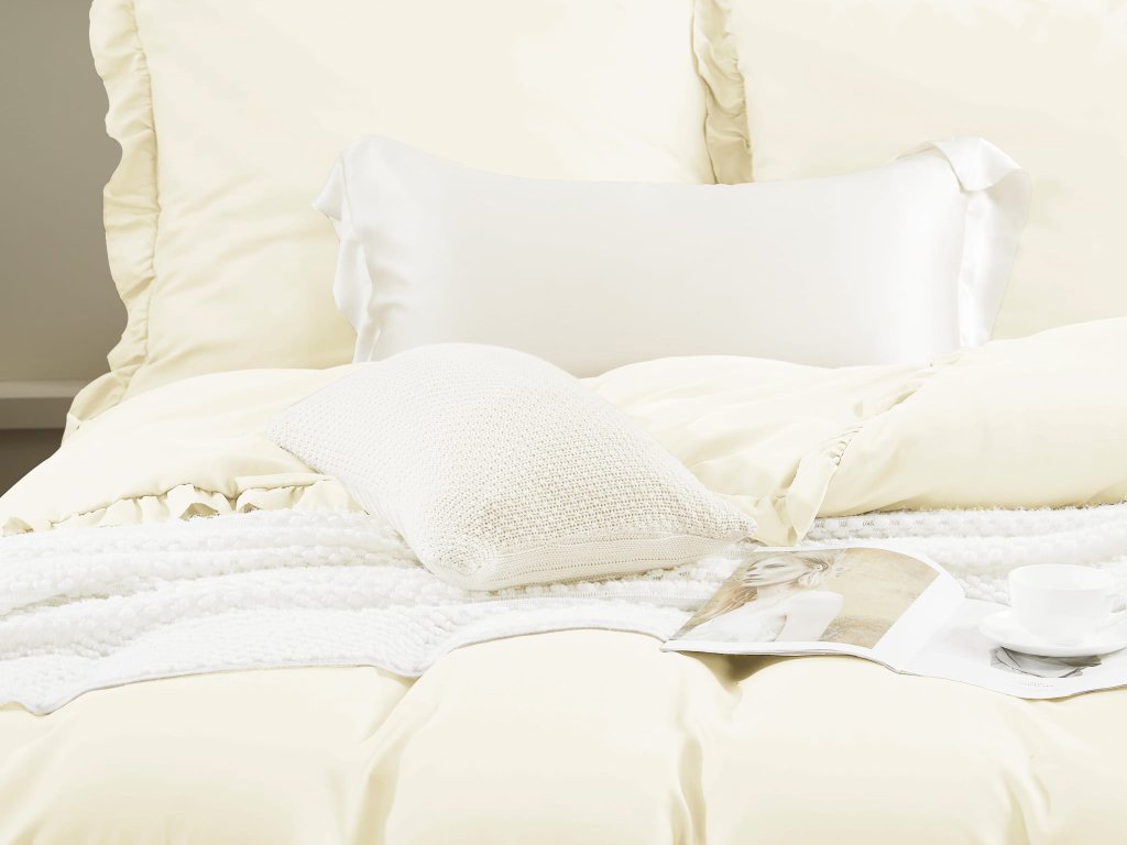 Kvalitetna posteljina u krem boji dodaje vašoj spavaćoj sobi nježnost i eleganciju. Osim toga, ukrašena je volanima. Posteljina je izrađena od 100% mikrovlakana – izdržljivog sintetičkog materijala koji je jednostavan za održavanje, odbija mrlje i odlično se nosi s trošenjem. Dio ovog seta su navlaka/navlake za jastuke i poplun, koje osiguravaju maksimalnu udobnost i ugodnu toplinu tijekom spavanja.