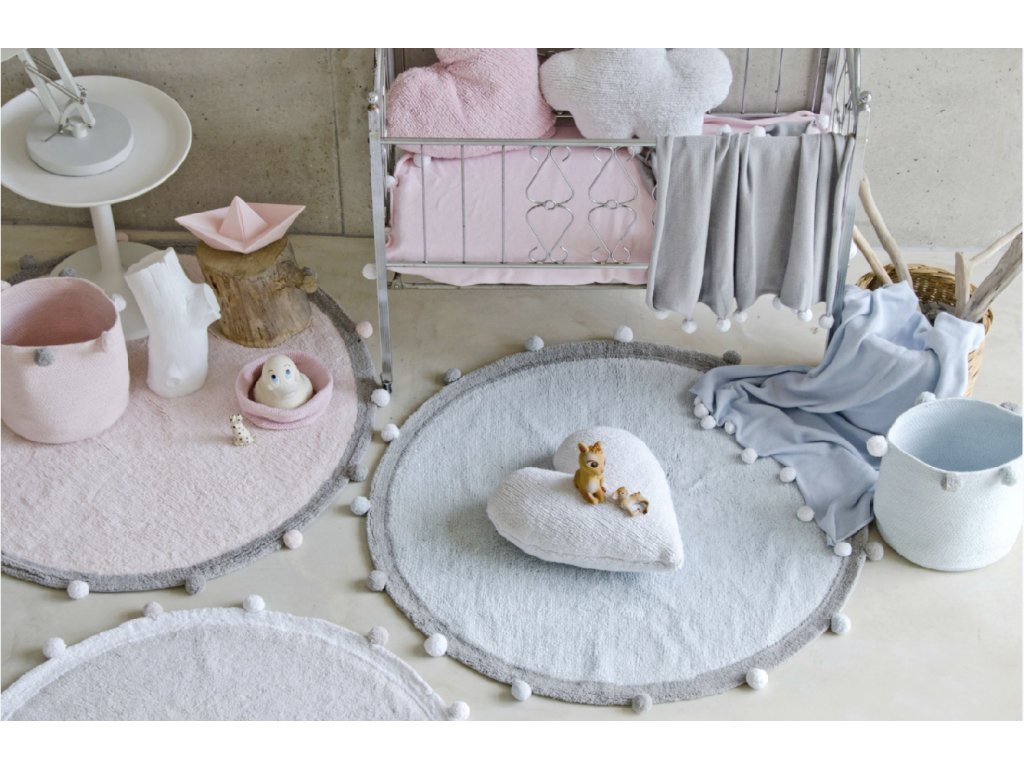 Dječji tepih BUBBLY 120x120 cm ružičasti je okrugli tepih sa sivim rubom i pomponima, izrađen od 100% pamuka. Tepih izgleda sjajno u djevojačkim sobama, zahvaljujući nježnoj i elegantnoj kombinaciji pastelnih boja. Ručno izrađen tepih je siguran za djecu jer se koriste samo prirodne boje. Ima nekoliko certifikata ISO 9001, ISO 14001 i ISO 18001, kao i certifikate AITEX, koji jamče kvalitetu obrade za zdravlje i sigurnost korisnika. Zahvaljujući upotrebi pamuka, tepih je mekan, lagan i fleksibilan, idealan za dječju sobu.