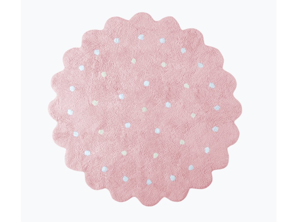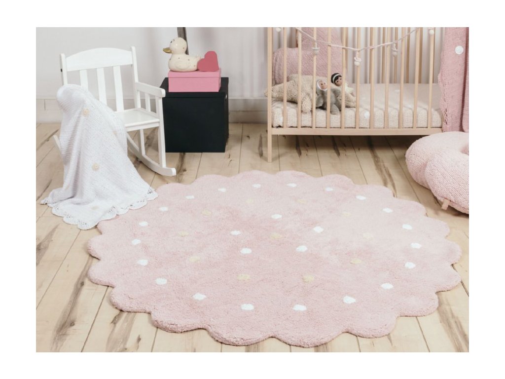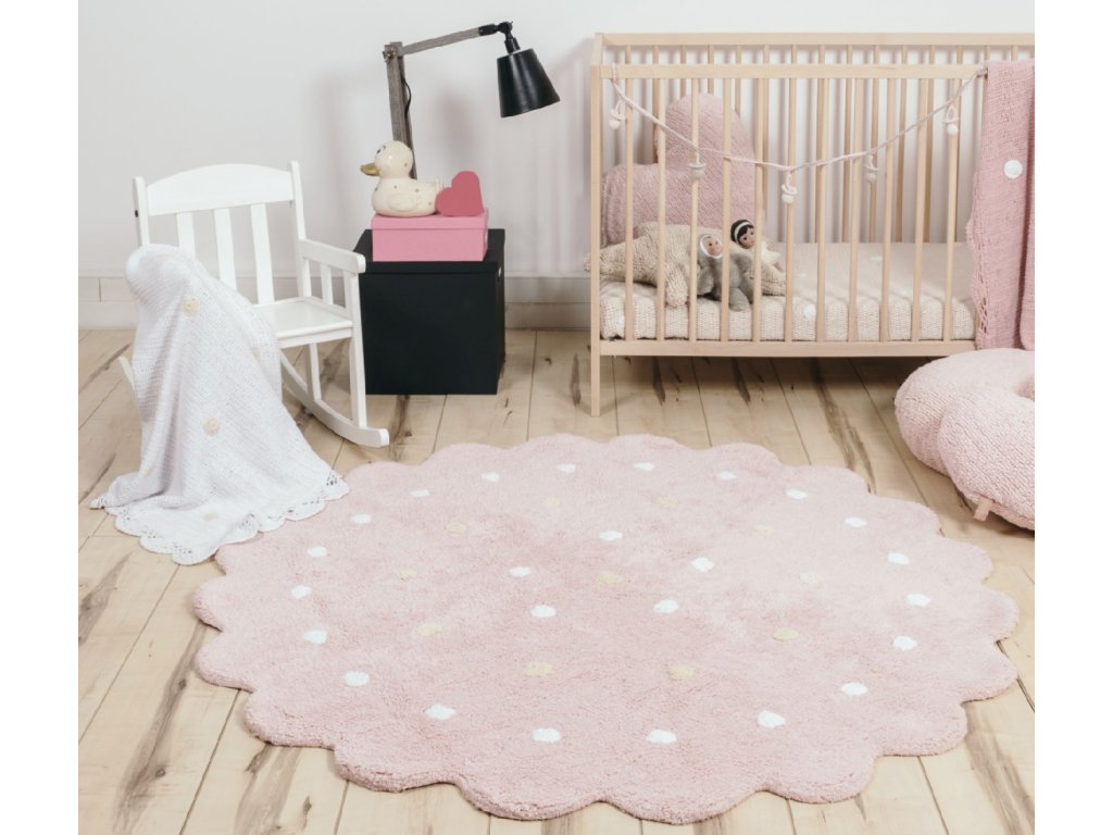 Veliki okrugli tepih španjolske marke Lorena Canals izrađuje se ručno od kvalitetne pamučne pređe u nježnoj ružičastoj boji. Okrugli oblik, valoviti rub i točkice daju mu originalan karakter. Postat će ukras dječje sobe, ali jednako savršeno će izgledati u sobi za mlade. Za djecu stvara savršenu toplinsku izolaciju. Dostupan je u veličini 140 cm.
