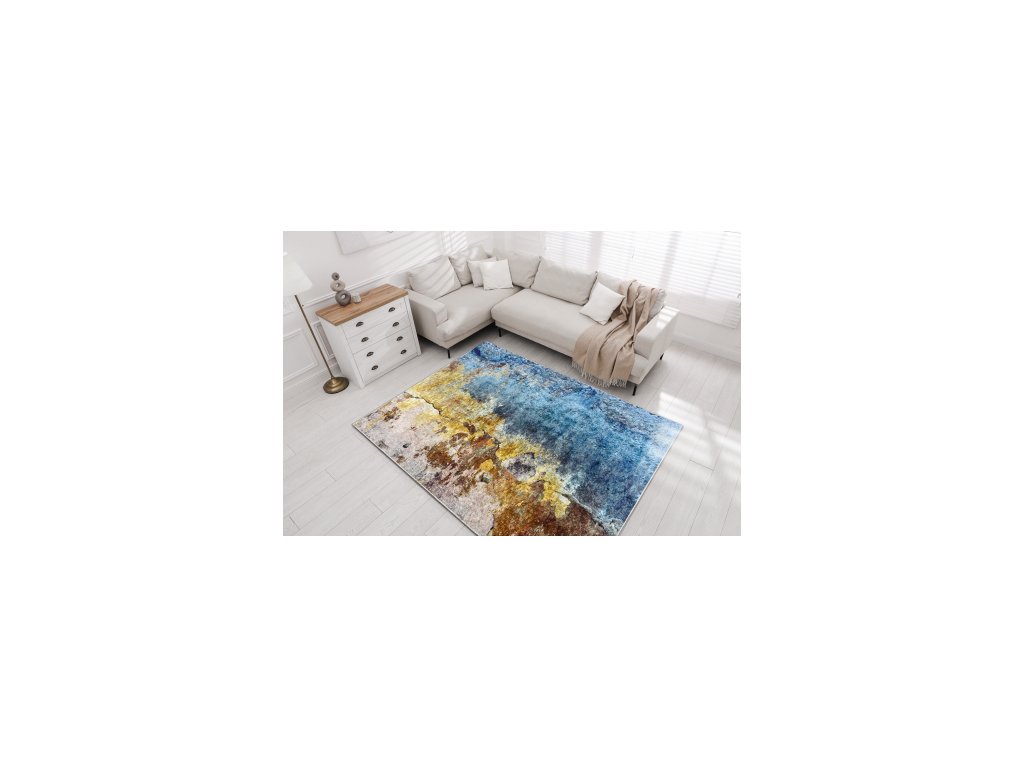 Oživite svoj interijer s našim plavim apstraktnim tepihom Miro, koji donosi u prostoriju moderan i umjetnički dodir. Ovaj tepih je izrađen od kvalitetnog poliestera, što jamči njegovu dugotrajnost i otpornost. Njegov pravokutni oblik i jedinstvene kombinacije boja plave i zlatne stvaraju jedinstveni vizualni efekt koji se uklapa u svaki moderan prostor. Tepih je također protuklizan, što povećava njegovu sigurnost i praktičnost.