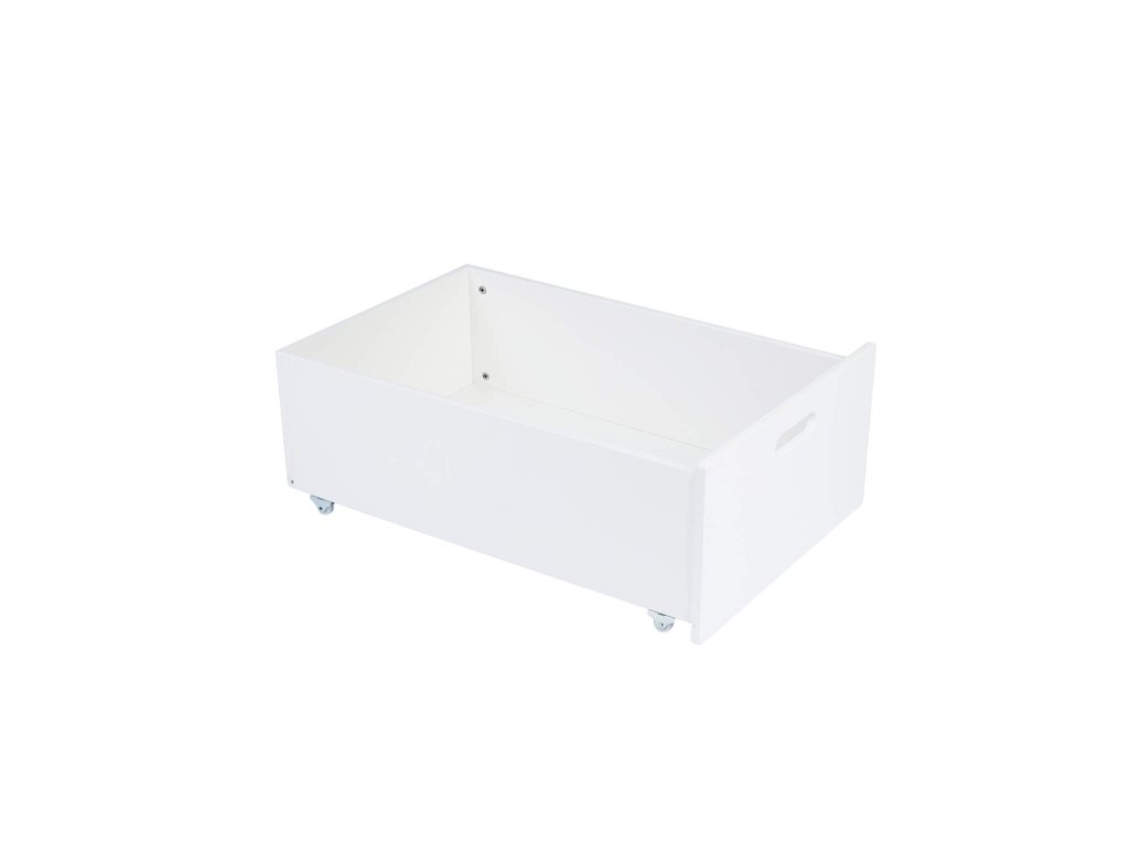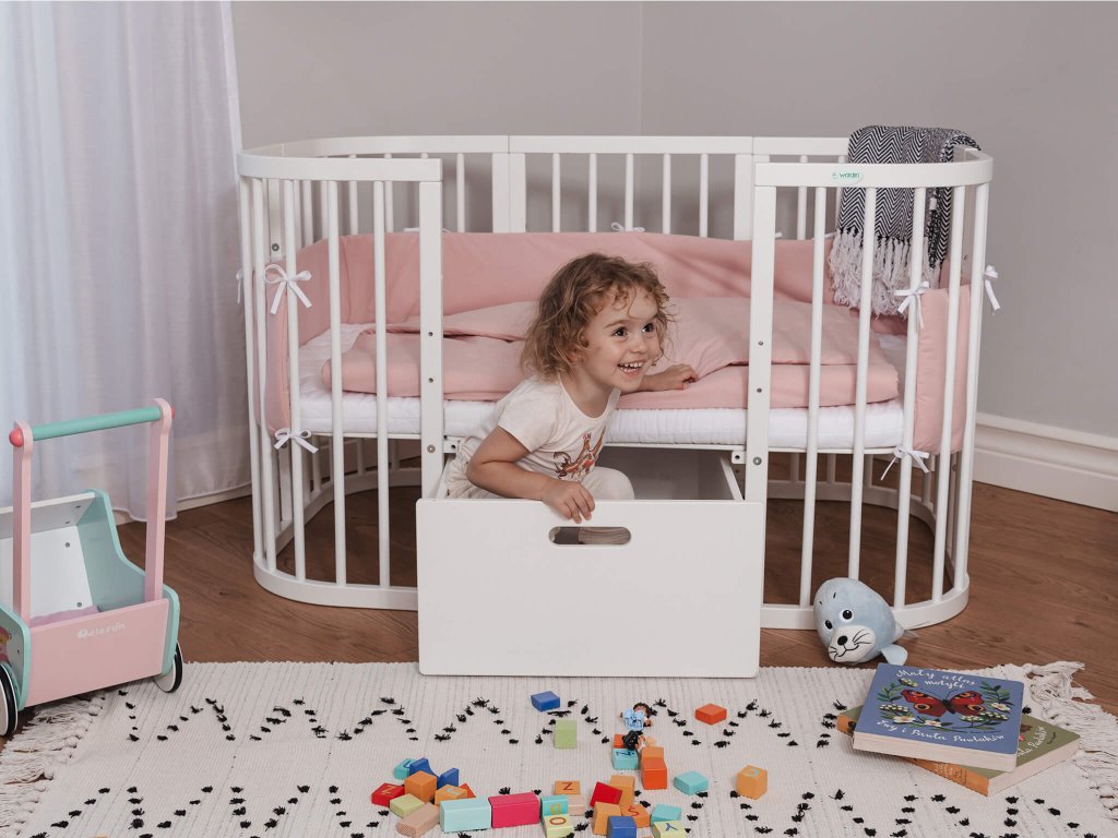 Praktična kutija za pohranu ispod rastućeg krevetića 7u1. Ladica odgovara ispod klasičnog i ispod ovalnog rastućeg krevetića 7u1. Kada otvorite stranu krevetića i postavite rešetku na odgovarajuću visinu, bijela kutija za pohranu lijepo će se uklopiti u prostor ispod krevetića. Djeca mogu, na primjer, u kutiju odlagati igračke ili u njoj možete držati jastučiće i deke.