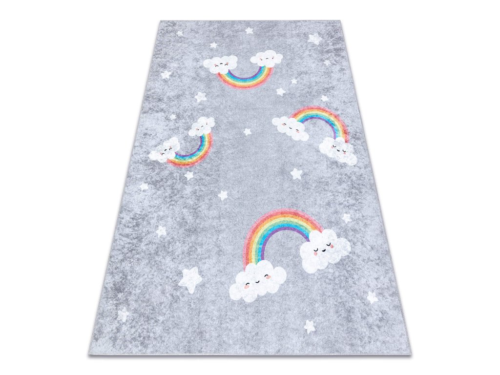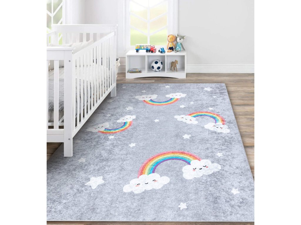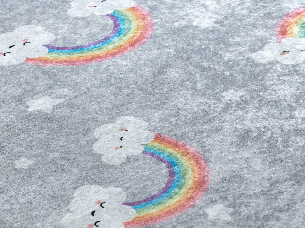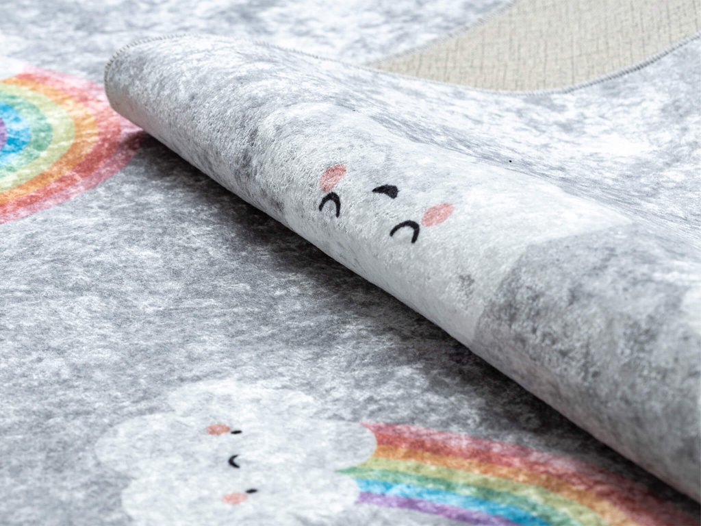 Dječja soba sastoji se od mnoštva igračaka i stvari koje služe za razvoj i rast djeteta. Ispravno je u dječju sobu uključiti i tepih koji stvara mekšu površinu za igru, ležanje i slično. Sivi protuklizni tepih Duga namijenjen je kako za dječaka tako i za djevojčicu. On je sjajan element zahvaljujući dugi i oblacima koji su na njemu prikazani. Ovaj tepih je moguće prati u perilici na 30°C, zahvaljujući čemu je njegovo održavanje mnogo jednostavnije. Tepih ima kratku dlaku, stoga je čišćenje jednostavno. Izrađen je od 100% poliestera, koji je pogodan za alergičare i djecu. Protuklizno dno sprječava pomicanje proizvoda po podu. Odlično će poslužiti i pri korištenju podnog grijanja.
