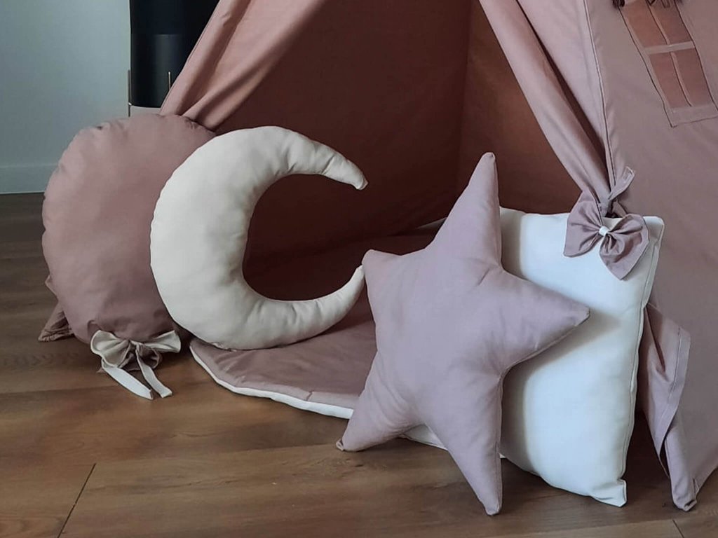 Mjesto za dobro raspoloženje, bezbrižnost i maštu. Pružite svojoj djeci dječji bajkoviti svijet s teepee šatorom. Neka vaša djeca otkrivaju i stvaraju svoje vlastito kraljevstvo. Šator je sjajno mjesto za male bebe, ali i stariju djecu. Dijete tamo može odmarati na jedinstvenim jastucima, čitati bajku ili se igrati s omiljenom igračkom. Svojim dizajnom savršeno će se uklopiti u djevojačke dječje sobe i bit će tamo savršen ukras. Dio šatora je jastuk oblak, zvijezda, mjesec i bijeli jastuk s mašnom. Jastučići će biti dobar pratitelj u igri. Šator nudi djeci mogućnost skrivanja ili igranja na tvrđavu. Otvor šatora možete jednostavno pričvrstiti trakama. Zahvaljujući malom prozorčiću s roletom osjećat će se sigurno i istovremeno moći pratiti što se događa oko njih. Lagan je i jednostavno se može premjestiti gdje god želite da dijete bude. Kvalitetni i antialergijski materijali jamče udobnost. Staroružičasta boja idealna je za sobu za djevojčice. Dekorativni element u obliku balona je obješen iznad ulaza u šator.