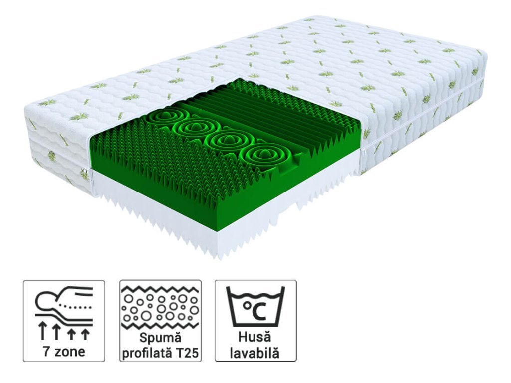 Profilirana 7-zonska visokokvalitetna pjena poboljšava cirkulaciju krvi u koži i opuštanje mišića tijekom spavanja. Pod utjecajem tjelesne temperature prilagođava se obliku tijela, čime povećava osjećaj ugodnog sna. Zahvaljujući sustavu 7 zona tvrdoće, pruža prirodan položaj i potporu kralježnici i cijelom tijelu. Ova pjena također je prikladna za alergičare.