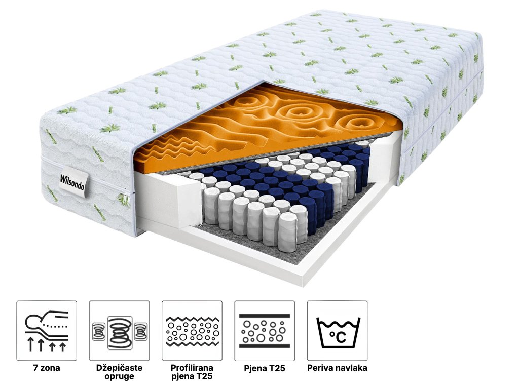 Materijalni sastav: Filc, Džepičaste opruge(više od 289 opruga/m2), Poliuretanska pjena T25 s gustoćom 25 kg/m3, Navlaka Aloe Vera