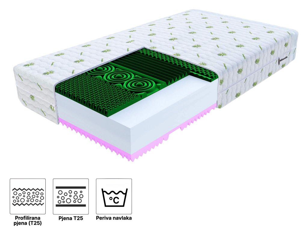 Profilirana 7-zonska visokokvalitetna pjena poboljšava cirkulaciju krvi u koži i opuštanje mišića tijekom spavanja. Pod utjecajem tjelesne temperature prilagođava se obliku tijela, čime povećava osjećaj ugodnog sna. Zahvaljujući sustavu 7 zona tvrdoće, pruža prirodan položaj i potporu kralježnici i cijelom tijelu. Ova pjena također je prikladna za alergičare.