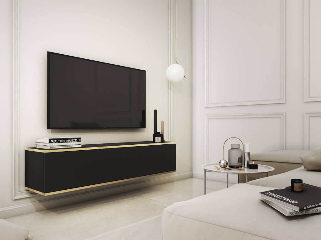 TV stolić Oro je elegantan i moderan dodatak za vaš dnevni boravak. Njegova crna boja djeluje sofisticirano i ukusno. Sa širinom od 135 cm nudi dovoljno prostora za vaš televizor i druge uređaje. Izrađen od kvalitetne laminirane iverice s preciznim ABS rubovima, stolić je ne samo vizualno privlačan, već i otporan na svakodnevno trošenje. Dva preklopna ormarića pružaju prostor za pohranu raznih predmeta, što pomaže održavanju reda u vašem prostoru. Zlatni obrub dodaje dašak luksuza i elegancije. Stolić je dizajniran tako da bude obješen na zid bez potrebe za nogama, što stvara dojam lebdećeg namještaja i istovremeno oslobađa prostor ispod njega. Sustav push-to-open doprinosi minimalističkom izgledu stolića, omogućujući jednostavno otvaranje ormarića bez potrebe za ometajućim ručkama. Oro TV stolić je idealan izbor za one koji traže spoj modernog dizajna, praktičnosti i elegancije za svoj dnevni boravak.