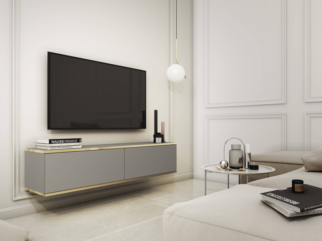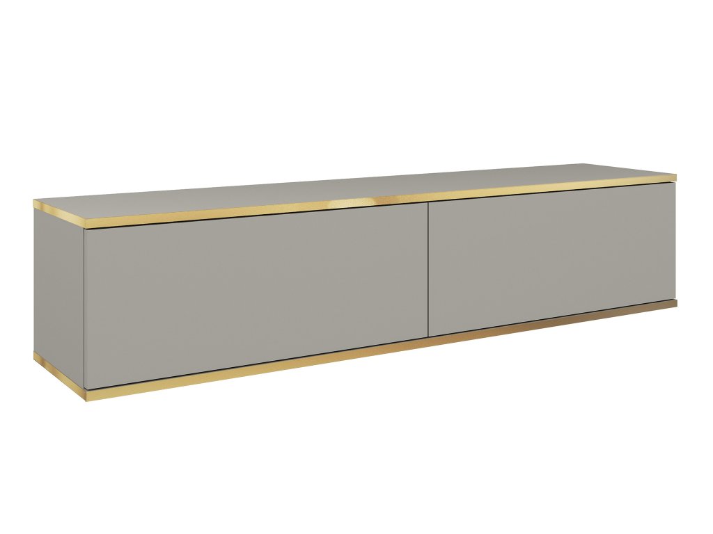 Predstavljamo vam TV stolić Oro, koji je elegantan i moderan dodatak za vaš dnevni boravak. Njegova privlačna siva boja djeluje elegantno i nije ometajuća. Sa širinom od 135 cm nudi dovoljno prostora za vaš televizor i druge uređaje. Izrađen od kvalitetne laminirane iverice s preciznim ABS rubovima, stolić je ne samo vizualno privlačan, već i otporan na svakodnevno trošenje. Dva preklopna ormarića pružaju prostor za pohranu raznih predmeta, što pomaže održavanju reda u vašem prostoru. Zlatni obrub dodaje dašak luksuza i elegancije. Stolić je dizajniran tako da bude obješen na zid bez potrebe za nogama, što stvara dojam lebdećeg namještaja i istovremeno oslobađa prostor ispod njega. Sustav push-to-open doprinosi minimalističkom izgledu stolića, omogućujući jednostavno otvaranje ormarića bez potrebe za ometajućim ručkama. Oro TV stolić je idealan izbor za one koji traže spoj modernog dizajna, praktičnosti i elegancije za svoj dnevni boravak.